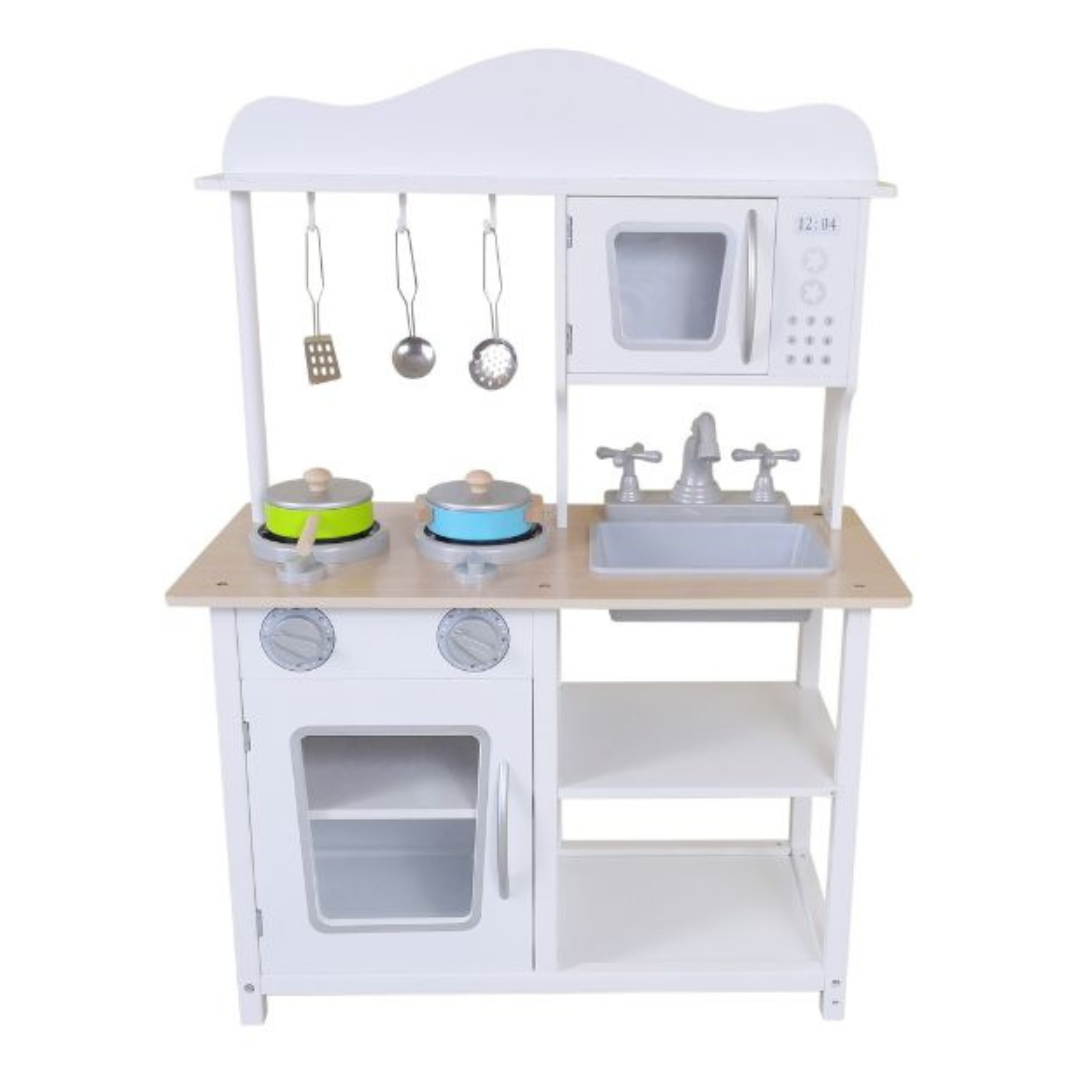 Drvena kuhinja sa dodacima 11/71484 San svakog malog kuvara u kući! Vaše dete će uživati u stvaranju izmišljenih jela i učenju kroz simulaciju svakodnevnih kuvarskih aktivnosti. Ova drvena kuhinja ima moderni izgled sa mikrotalasnom pećnicom i izduvnim ventilatorom. Idealna je visina za vašeg malog kuhara.